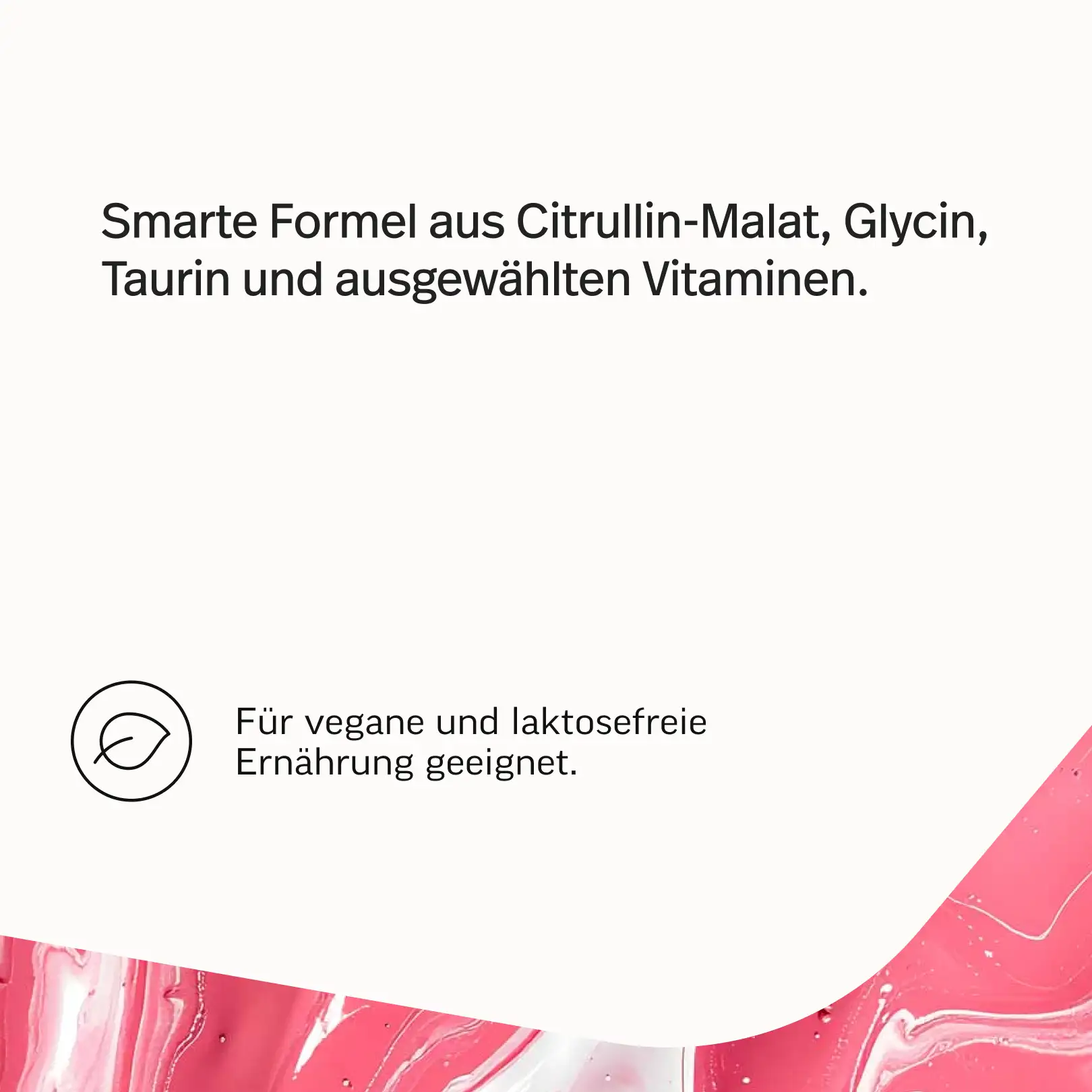 Unser Produkt ist ein wohlschmeckendes, erfrischendes Pulver, das sämtliche Kofaktoren enthält, unter anderem Vitamin C aus Acerola-Extrakt, Citrullin in der bekannten Malat-Form (Citrullinmalat), Folsäure in zwei Formen (für die optimale Wirkung), bioaktives Vitamin B12, Glycin, Taurin und den Pflanzenstoff Granatapfel-Extrakt.